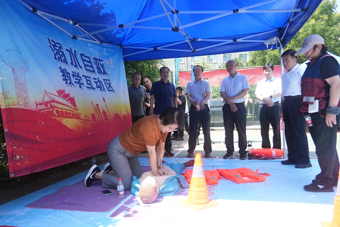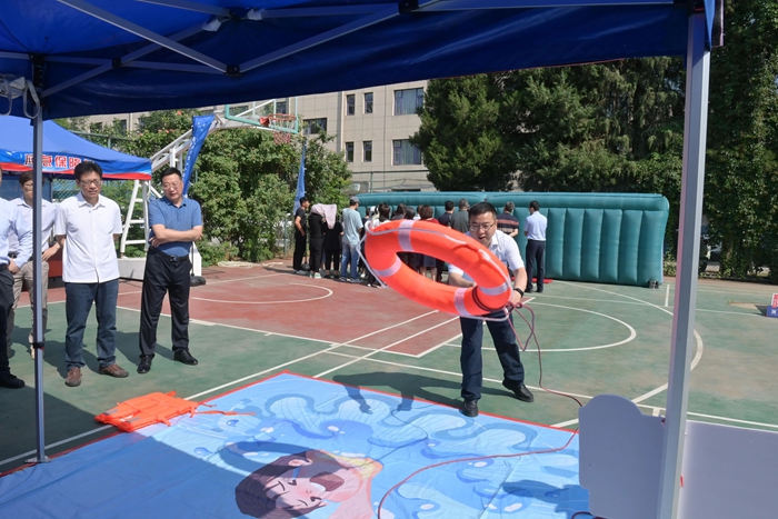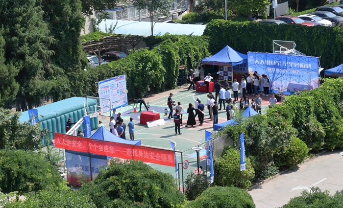 演練結(jié)束后,舉辦方在大廈籃球場(chǎng)開啟安全咨詢體驗(yàn)活動(dòng)。整個(gè)活動(dòng)共設(shè)置了6個(gè)項(xiàng)目,分別為擁擠踩踏應(yīng)急處置體驗(yàn)區(qū)(充氣帳篷)、消防隱患排查試驗(yàn)區(qū)、電動(dòng)車電池穿刺爆燃體驗(yàn)裝置、溺水自救互救教學(xué)培訓(xùn)區(qū)、醉酒交通AR模擬體驗(yàn)、安全標(biāo)志互動(dòng)區(qū)。活動(dòng)現(xiàn)場(chǎng)氣氛熱烈,盡管天氣炎熱,但絲毫沒有減弱大家體驗(yàn)掌握應(yīng)急技能的熱情。