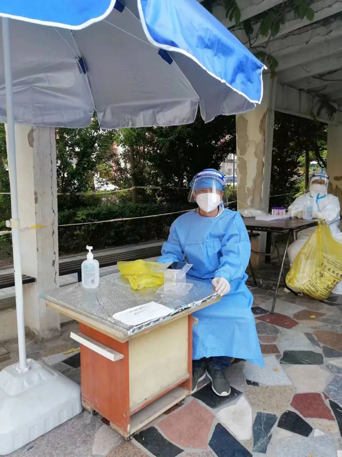 隨著天氣愈發(fā)的燥熱,換上大白的我們,衣服瞬間就已經(jīng)濕透了,但大家沒有一句怨言,繼續(xù)戰(zhàn)斗在檢測一線。有的時候做核酸的居民太多,我們的醫(yī)護人員和志愿者不能按時吃飯,好在小區(qū)的群眾都很配合,一句句“謝謝,辛苦了”沁入心脾,真的很感動。