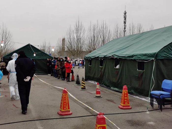 采樣期間,因人員較多,采樣工作都在室外進(jìn)行。工作在最低溫度達(dá)到零下10度左右的環(huán)境里,42名應(yīng)急隊(duì)員穿戴全副武裝的防護(hù)服,不僅要直面寒冷天氣的侵襲,還要克服醫(yī)用防護(hù)服、醫(yī)用防護(hù)眼鏡、防護(hù)口罩等一層層防護(hù)用品所帶來(lái)的不便。