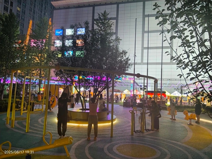夏日傍晚,位于東四環(huán)的華騰新天地商場(chǎng)前,繽紛夜市+休閑廣場(chǎng),周邊居民享受著夏日晚間的熱鬧繽紛與閑暇舒適。